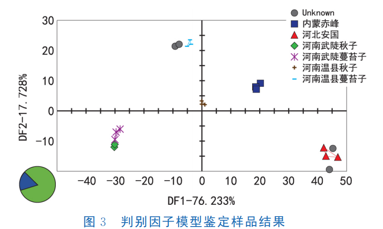 未知樣品分別為屬于河北安國樣品組的河北安國X、河北安國Y及屬于河南溫縣蔓苔子樣品組的河南溫縣蔓苔子X、河南溫縣蔓苔子Y。由此可知判別因子模型為有效模型,可用于不同產地牛膝種子的區分,使PCA結果得到進一步驗證。