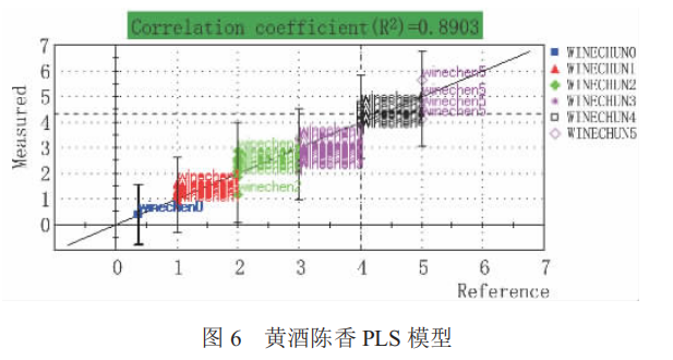 從表 1 可以看出, 所有樣品的醇香得分經交互驗證顯示,驗證準確率為 97.3 %。其中 25 號樣品醇香分值為5 分的酒樣,其預測得分略高,查得此樣品為 40 年陳釀,而 31 號樣品醇香分值為 5 分,預測結果相對接近,查得此樣品為 20 年陳釀。這可能是由于二者年份上的差異加上評分機制最高為 5 分,而導致預測結果略有偏離。在實際感官品評時,不影響其得到最高分值。