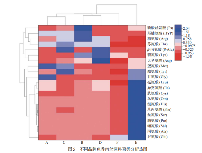 電子舌和氨基酸分析可見,不同品牌魚香肉絲調(diào)料在滋味上存在差異性,其中樣品 D 的酸味較為突出,樣品 A 的甜味較為突出,樣品 E 在咸味和鮮味較為突出。同時(shí),在樣品 E 中,鮮味氨基酸和甜味氨基酸對(duì)整體滋味貢獻(xiàn)顯著。不同品牌魚香肉絲調(diào)料的滋味特性與大部分游離氨基酸呈現(xiàn)正相關(guān),其中酸味和甜味分別與蘇氨酸和甘氨酸相關(guān)性顯著(P<0.05),咸味、鮮味和苦味與谷氨酸相關(guān)性極顯著(P<0.01)。