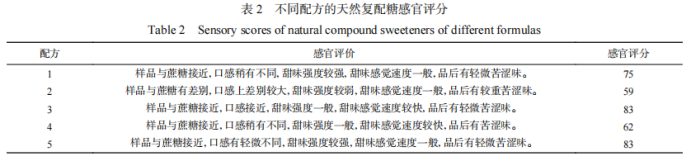 1.經感官評價(如表2)分析得到樣品3和8%蔗糖溶液的甜度相似。