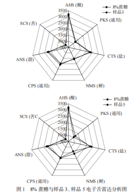 3.電子舌傳感器雷達圖分析,如圖1所示,得到樣品3和8%蔗糖溶液甜度相似。