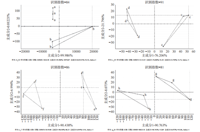 對不同濃度的兩種酸奶進行電子舌檢測,并進行味覺主成分分析。如圖10所示,濃度為4%、10%、12%同等甜度的兩種酸奶識別指數84、81、64均小于85,故此三個濃度下的兩種酸奶滋味不具有顯著性差異(P>0.05);而濃度為6%、8%同等甜度下的兩種酸奶識別指數分別為91、86均大于85,故兩個濃度下的兩種酸奶滋味具有顯著性差異(P<0.05)。