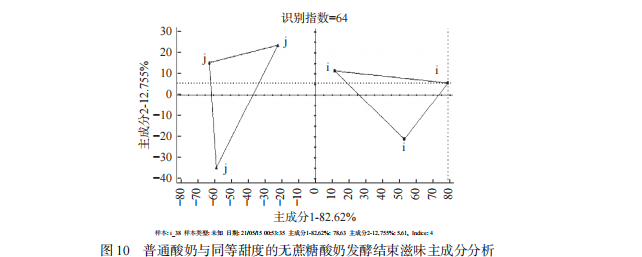 對發酵完成的無蔗糖酸奶和普通酸奶進行電子鼻氣味檢測,并進行主成分分析,如圖9所示。發酵結束后,蔗糖添加量在4%~12%的普通酸奶和添加同等甜度復配糖的無蔗糖酸奶,主成分1和主成分2之和大于95%,能夠很好的反映樣品的情況。4%、10%和12%識別指數分別為86、96和95,均大于85,故添加蔗糖濃度為4%、10%、12%的普通酸奶和添加同等甜度復配糖的無蔗糖酸奶氣味上具有顯著性差異(P<0.05);而6%、8%識別指數−0.5、32,均小于85。因此,添加蔗糖為6%、8%的普通酸奶和添加同等甜度復配糖的無蔗糖酸奶氣味更接近,無顯著性差異(P>0.05)。