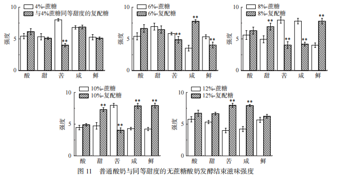 在滋味對比方面,不同濃度同等甜度下的兩種酸奶酸味、甜味、苦味、咸味、鮮味存在顯著性差異(P<0.05)(圖11)。添加復配糖的無蔗糖酸奶酸味強度值均比添加同等甜度蔗糖的普通酸奶大,但無顯著性差異(P>0.05)。蔗糖濃度為4%、6%普通酸奶的甜味強度值比添加同等甜度復配糖的無蔗糖酸奶甜味強度值大,蔗糖濃度為8%、10%、12%普通酸奶的甜味強度值小于添加同等甜度復配糖的無蔗糖酸奶。添加與12%蔗糖同等甜度復配糖的無蔗糖酸奶的苦味大于添加同等甜度蔗糖的普通酸奶,相同甜度的兩種酸奶在苦味、咸味、鮮味均存在顯著性差異(P<0.05)。濃度為4%、12%同等甜度下的兩種酸奶鮮味不存在顯著性差異(P>0.05),而濃度為6%、8%、10%同等甜度下的兩種酸奶鮮味存在顯著性差異(P<0.05)。