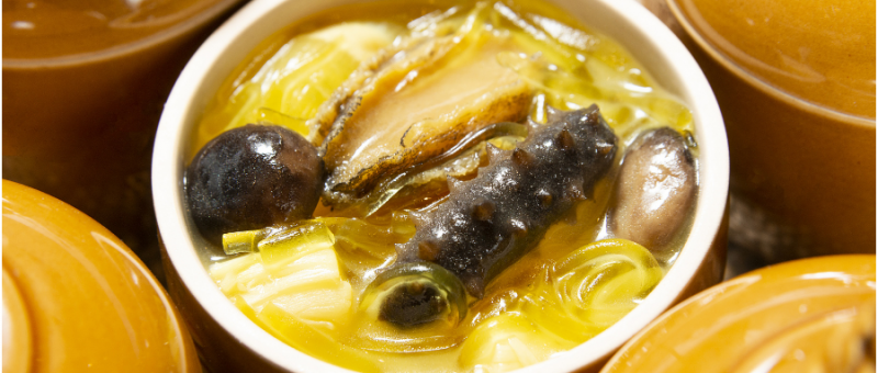 “佛跳墻”是傳統閩式菜肴的特色名菜之首,通常以鮑魚、海參、甲魚裙、魚膠、杏鮑菇、蹄筋、花菇、瑤柱和鴿子蛋等為原料,加入熬制好的高湯后文火煨制而成。“佛跳墻”因營養價值豐富、風味鮮美濃郁而廣受人們青睞。