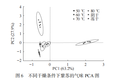 基于電子鼻記錄的風味物質(zhì)信息做出圖6所示的主成分分析圖,其中PC1貢獻率為63.2%、PC2貢獻率為27.9%,累計貢獻率為91.1%。凍干品、陰干品及50℃干燥品之間的置信區(qū)間無重疊,三者可以較好地區(qū)分開。而剩余三個溫度條件下的紫蘇氣味信息有部分重疊,說明三者的主要氣味信息差異較小??傮w來看,凍干品的氣味信息與其他干燥品相比較差異更顯著,而陰干品與智能排濕干燥品的氣味主成分相似,含量上有一定差異。表5反映了各個溫度條件下紫蘇葉的具體氣味信息。
