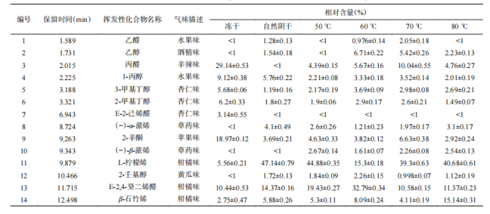 表5 不同干燥條件下紫蘇的揮發(fā)性風味物質(zhì)分析