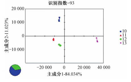同一品種不同產地生地黃鑒別由圖4可知,PC1與PC2的貢獻率之和達到了95.057%,其識別指數達到99,說明基于氣味上的差異能有效區分不同產地地黃樣品。河南溫縣與甘肅所產“北京3號”各單獨分布在一個區域,與其他產區氣味差別較大;山西與陜西所產“北京3號”氣味差別較小,利用AroChemBases數據庫對篩選出的差異較大的色譜峰進行定性可知,生地黃氣味差異可能由于乙醛、乙醇、2,3?丁烷、乙腈、己醛等揮發性氣體含量差異引起,說明使用電子鼻能迅速區分同一品種不同產地生地黃。