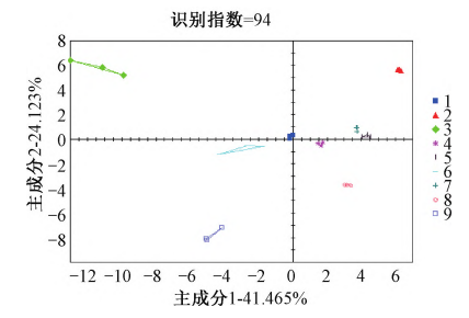 由圖4可知,PC1與PC2的貢獻率之和達到了95.057%,其識別指數達到99,說明基于氣味上的差異能有效區分不同產地地黃樣品。河南溫縣與甘肅所產“北京3號”各單獨分布在一個區域,與其他產區氣味差別較大;山西與陜西所產“北京3號”氣味差別較小,利用AroChemBases數據庫對篩選出的差異較大的色譜峰進行定性可知,生地黃氣味差異可能由于乙醛、乙醇、2,3?丁烷、乙腈、己醛等揮發性氣體含量差異引起,說明使用電子鼻能迅速區分同一品種不同產地生地黃。