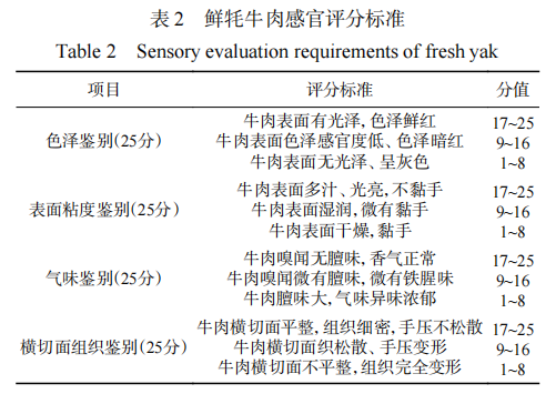 感官評價 參考GB/T22210-2008《國家肉與肉制品感官評定規范標準》鑒定標準,隨機選取10位烹飪營養與教育專業學生組成評定小組,先期進行感官評價培訓,內容包括:肉類色澤鑒別、肉類表面粘度鑒別、肉類氣味鑒別、肉類橫切面組織鑒別。然后在專業感官品評實驗室對樣品進行感官評價。評分標準見表2。