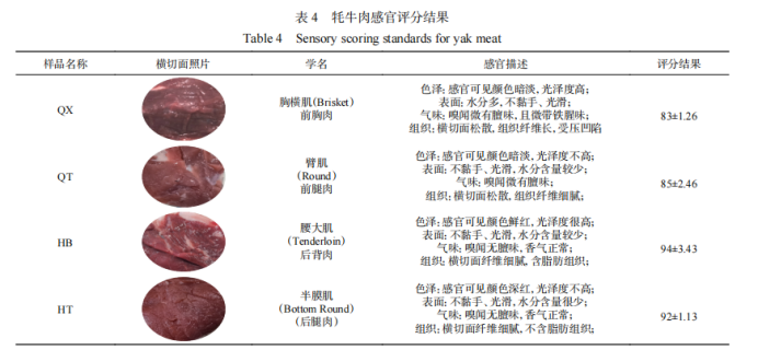 本研究以牦牛前胸肉、前腿肉、背部肉、后腿肉四個部位為研究對象,分別采用傳統感官評價和E-tongue、E-nose智能感官系統,以及SPME-GC-MS檢測揮發性化合物,運用感官評價、主成分分析(PAC)、聚類(CA)、相關性分析(Pearson)等方法,從牦牛肉風味特征入手,分析風味物質和滋味數據,找出影響牦牛肉風味特征的主要化合物。
