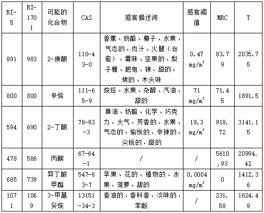 Discrimination power參數是根據化合物在不同組樣品中的分布計算得來, 若化合物的分布差異較大,例如某組含有此化合物而另外一組中未檢出此化合物,則計算出的Discrimination power越接近于1。若化合物在各組中分布較為均勻,則discrimination power 參數計算結果趨近于0。對于篩選出的差異化合物組分使用Arochembase數據庫進行檢索,嘗試定性和查找化合物的氣味屬性及閾值信息,可以衡量此化合物在氣味中的貢獻程度大小。