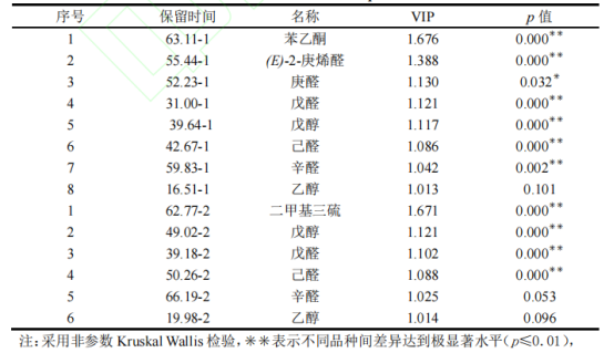 對于VIP>1的14個峰面積在4種粳米中的含量差異進行非參數KruskalWallis檢驗。結果見表4,MXT-5柱共有6種香氣成分在4種粳米中的含量具有極顯著差異(p≤0.01),它們分別是苯乙酮、(E)-2-庚烯醛、戊醛、戊醇、己醛、辛醛;庚醛在4種粳米中的含量具有顯著差異(p≤0.05);乙醇在4種粳米中的含量無顯著差異。MXT-1701柱共有4種香氣成分在4種粳米中的含量具有極顯著差異(p≤0.01),它們分別是二甲基三硫、戊醇、戊醛、己醛;辛醛、乙醇在4種粳米中的含量無顯著差異。綜上,結合VIP>1的變量和非參數KruskalWallis檢驗結果,鑒定出8種香氣成分是區分4種東北粳米的關鍵香氣成分,分別為苯乙酮、(E)-2-庚烯醛、戊醛、戊醇、己醛、辛醛、庚醛、二甲基三硫。