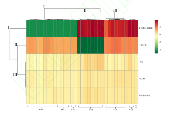 基于快速氣相電子鼻數據所得關鍵香氣成分層次聚類分析 通過對8種香氣成分熱圖繪制并進行HCA,如圖6所示,對于香氣成分的聚類主要為3類。Ⅰ區化合物為(E)-2-庚烯醛,僅通過MXT-5檢出,能較好地區分五優稻4號、綏粳18和龍粳31、鹽豐47,它在五優稻4號中含量最高,綏粳18次之,而在龍粳31和鹽豐47中未檢出;與電子鼻不同的是在GC-MS中,4種粳米均檢出(E)-2-庚烯醛,但在含量的分布規律上與電子鼻基本一致。(E)-2-庚烯醛是在蔓越莓、柑橘和土豆中檢測到的香氣成分。Ⅱ區香氣成分有己醛、戊醇、戊醛,它們在兩個色譜柱中均有檢出,能對五優稻4號、綏粳18和龍粳31、鹽豐47進行一定區分,總體含量上五優稻4號大于其它三個品種粳米。己醛和戊醛為亞油酸氧化的產物,提供果香和甜香,醇類為不飽和脂肪酸氧化的副產物,由醛的進一步分解形成,但醇類的氣味閾值一般較高,對香氣的整體貢獻較小。Ⅲ區化合物為僅通過MXT-5檢出的苯乙酮、庚醛、辛醛和僅通過MXT-1701檢出的二甲基三硫,它們在4種粳米中的分布并無明顯差異。二甲基三硫等硫化物被認為是在烹飪過程中產生的特征揮發物,在一些常見的米制品如年糕和米酒中也均有檢出。 對于品種的聚類主要分為4類。Ⅰ區和Ⅱ區主要為龍粳31和鹽豐47,它們的香氣成分含量較其它兩個品種的粳米偏低。Ⅲ區為部分的五優稻4號,它在(E)-2-庚烯醛、己醛、戊醇、戊醛的含量上顯著高于其它樣品。Ⅳ區為部分五優稻4號和綏粳18,它們的(E)-2-庚烯醛、己醛、戊醇、戊醛含量低于Ⅲ區,高于Ⅰ區和Ⅱ區,其中Ⅳ區五優稻4號的樣品在上述成分的含量上又略高于同區的綏粳18。總體上看,通過HeraclesNEO快速氣相電子鼻所得數據分析,香米和非香米樣品區分效果較好,五優稻4號香氣組分含量高于其它3個品種的粳米,這與GC-MS檢測數據分析結果一致。