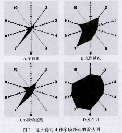 圖 2為四種處理方法在貯藏第 13d時中國對蝦氣味檢測的雷達圖,從圖 2 中可以看出,電子鼻對蝦肉中的揮發性物質有明顯響應,其中傳感器7(W lw )、傳感 2(W5S)和傳感器 9(W2W )響應值較明顯。其中空白組的響應值最大,說明在貯藏期內中國對蝦中有大量的硫化物產生。與空白組相比,3種涂膜保鮮效果的響應值均有一定程度的減少,其中復合涂膜組的響應值最小,說明涂膜可以在一定程度上減緩硫化物的生成。電子鼻的雷達圖可以直觀的區分出四種處理效果的不同,因此,可以利用電子鼻技術檢測中國對蝦的新鮮程度。