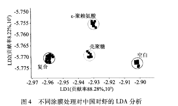 采用 PCA 和LDA 兩種方法,對不同涂膜處理的中國對蝦在同一貯藏時間下的電子鼻響應值進行分析,結果顯示,電子鼻檢測可以有效的區分四種處理方法,其中 PCA 分析所得總貢獻略高于 LDA 分析結果。