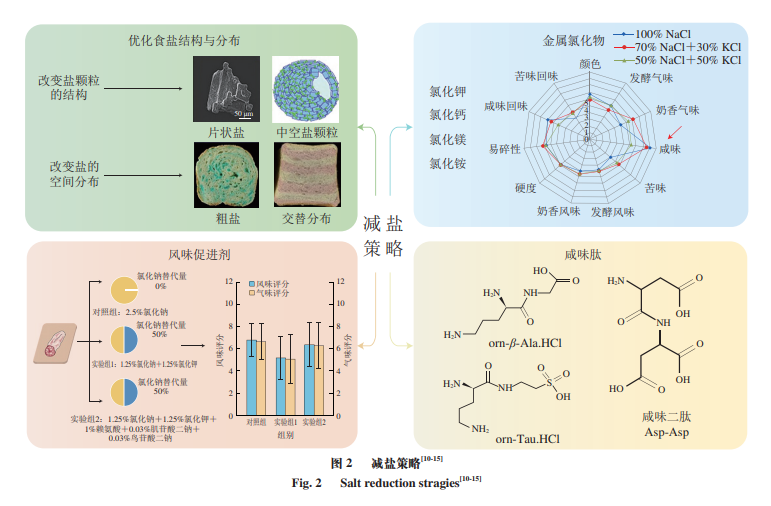 要達(dá)到“減鹽不減咸”的目的,可以基于以上咸味傳導(dǎo)途徑的特點(diǎn),從多方面、多角度減少Na+過量攝入。如通過設(shè)計(jì)食物中Na+分布等,提高咀嚼過程中Na+在口腔中的釋放速率;或者使用非Na+的金屬鹽代替NaCl作為咸味調(diào)味品;除此之外,還可使用非離子型的風(fēng)味促進(jìn)劑,如咸味香精、咸味肽等提高咸味的感知。目前常見的減鹽策略如圖2所示。