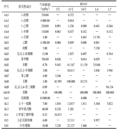 金針菇品種繁多,并且各種新品種不斷研發栽培。不同品種金針菇的生長特性、出菇特性、商品性狀和生物轉化率不同,而風味物質也存在各自的差別和獨特之處。本研究采用SPME-GC-MS和電子鼻分析5個品種金針菇揮發性物質,由定量分析、PCA、HCA探究不同品種金針菇揮發性物質差異,并通過SPME-GC-MS結合電子鼻進行PCA對比品種鑒定準確率。 5個金針菇樣品組(3號、11號、54號、L4和L7),測定前將樣品用液氮研磨。 用液氮研磨后,準確地稱量2.0g金針菇樣品于20mL頂空瓶中。將DVB/CAR/PDMS型萃取頭在250℃活化20min后,在60℃水浴中進行靜態吸附萃取40min,將萃取頭放入GC進樣口解吸。 以正構烷烴的實際測量值校正保留時間,SPME-GC-MS測定結果通過NIST98數據庫(NIST08,華盛頓特區)進行檢索,取匹配度80%以上的揮發性成分;以2-氯苯甲醛為內標物對各化合物進行定量分析。 用液氮研磨后,精確稱取2.0g金針菇樣品于20mL頂空瓶內。樣品測量流速150mL/min,檢測時間120s。電子鼻配備12個不同的氣體傳感器:LY2/LG、LY2/G、LY2/AA、LY2/GH、LY2/gCTL、LY2/gCT、T30/1、P10/1、P10/2、P40/1、T70/2和PA/2,通過傳感器陣列響應和模式識別技術對揮發性氣體分子進行分析。 利用相對氣味活度值(relativeodoractivityvalue,ROAV)評定各揮發性化合物對樣品總體氣味的貢獻,定義對樣品風味貢獻最大的組分:ROAVstan=100,則其他揮發性化合物的ROAV小于100,按下式計算: