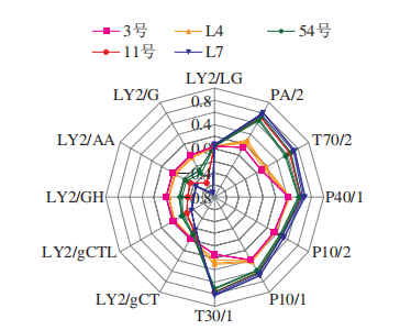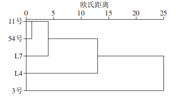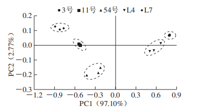 式中:Cri、Ti分別為各揮發性化合物的相對含量/%和氣味閾值/(μg/kg);Crstan、Tstan分別為對樣品風味貢獻最大組分的相對含量/%和氣味閾值/(μg/kg)。 ROAV≥1的物質為該品種金針菇的特征揮發性物質;0.1≤ROAV<1的物質對該品種金針菇整體風味有修飾作用,且ROAV越大說明該物質對該品種樣品總體風味貢獻越大。 不同品種金針菇揮發性物質的SPME-GC-MS分析 如表1所示,5個品種金針菇樣品中共檢測出53種揮發性成分,3號、11號、54號、L4和L7分別檢測出21、29、21、12種和18種成分,其中醇類、醛類和芳香烴類占總含量的60%~95%。不同品種金針菇僅有2種共有揮發性成分,分別為1-己醇和2-十一烷酮。每種金針菇都有3種或3種以上其他品種中不存在的化合物,3號、11號、54號、L4和L7中特有化合物數量分別為3、12、3、4種和4種。 如表2所示,辛醛、苯乙醛、壬醛、癸醛、2-十一烷酮、2-甲基丁酸甲酯、D-檸檬烯為3號金針菇的特征揮發性物質(ROAV≥1),香葉基丙酮對3號金針菇的整體風味起修飾作用(0.1≤ROAV<1);1-己醇、反式-2-庚烯醛、辛醛、反式-2-辛烯醛、壬醛、2-十一烷酮、香葉基丙酮、2-正戊基呋喃、D-檸檬烯為11號金針菇的特征揮發性物質(ROAV≥1),1-庚醇、1-辛醇對11號金針菇的整體風味起修飾作用(0.1≤ROAV<1);1-壬醇、辛醛、壬醛、癸醛、2-十一烷酮、D-檸檬烯為54號金針菇的特征揮發性物質(ROAV≥1),1-辛醇、反式-2-庚烯醛對54號金針菇的整體風味起修飾作用(0.1≤ROAV<1);1-壬醇、庚醛、辛醛、反式-2-辛烯醛、癸醛、2-十一烷酮、2-正戊基呋喃為L4金針菇的特征揮發性物質(ROAV≥1),1-己醇對L4金針菇的整體風味起修飾作用(0.1≤ROAV<1);反式-2-辛烯醛、反,反-2,4-癸二烯醛、癸醛、2-十一烷酮為L7金針菇的特征揮發性物質(ROAV≥1),1-己醇、1-辛醇、反式-2-庚烯醛對L7金針菇的整體風味起修飾作用(0.1≤ROAV<1)。 5種金針菇中共檢測出5種醇類化合物,存在于4個品種金針菇中的1種,是1-辛醇,1-庚醇和1-戊醇均只在11號金針菇中被檢測到。 5種金針菇中共檢測出10種醛類化合物,在4種金針菇中被檢測到的有3種,分別為己醛、辛醛和癸醛,庚醛、苯乙醛和反,反-2,4-癸二烯醛分別是L4、3號和L7金針菇中特有化合物。酸類化合物只在54號金針菇中被檢測到,5種金針菇中共檢測出7種酯類化合物。其中只有鄰苯二甲酸二異丁酯存在于2種金針菇中,其他6種化合物均屬于特有化合物。5種金針菇中共檢測出3種酮類化合物,共有的1種,為2-十一烷酮。 5種金針菇中共檢測出6種烷烴類化合物,特有化合物2種,分別為壬烷和2,6,10,14-四甲基十六烷。 5種金針菇中共檢測出5種其他類化合物,獨有化合物有2種,分別為2-甲基-2-(1-甲基乙基)環氧乙烷和4,5,6,7-四氫-3,6-二甲基-苯并呋喃。 表2 不同品種金針菇樣品中揮發性成分及對應的ROAV 為了顯示5個品種金針菇樣品組中53種揮發性成分的差異,使用PCA對SPME-GC-MS進行分析。如圖1所示,前2個主要成分的貢獻率是85.15%;PC1占52.31%,PC2占32.84%。PC1和PC2都明確區分了不同品種,5個樣本組相互之間很好地分開,說明不同品種金針菇間揮發性風味相互獨立,且這2個主成分可代表樣品風味的主要特征。所有的揮發組分根據不同品種樣品組也同樣明顯地區分開,其中,54號金針菇樣品組與12種化合物分布重疊,11號金針菇樣品組與4種化合物分布重疊。而其他3個品種樣品組雖然沒有與化合物重疊,但四周都有各自相關的化合物。然而還是有很多比較分散的化合物,處于不同品種之間。這表明盡管使用53種揮發性化合物也可以將品種區分開,但是金針菇的揮發性風味物質較復雜,并且在不同品種中有許多相似的物質,因此僅用SPME-GC-MS判別不同品種金針菇風味較為局限。 圖1 不同品種金針菇樣品基于SPME-GC-MS的PCA 為了進一步分析SPME-GC-MS對于不同品種金針菇揮發性風味成分區分情況,將SPME-GC-MS數據進行HCA,結果如圖2所示。從圖2可以看出,不同品種金針菇揮發性成分的聚類樹狀圖顯示出3個主要類別。其中,11號、54號和L7的樣品被歸為一類,而L4和3號的樣本被分別歸為其余兩類。在第一大類中,11號和54號的樣品在最小距離水平上首先聚類,這說明二者的樣品揮發性成分相似度很高。隨著歐式距離的增加,L7的樣品也并入到這一類中。而當歐式距離增加至13時,L4與11號,54號和L7的樣品歸為一類。隨著歐式距離的繼續增大,當增至25時,三大類才歸為一類。這與2.1.2節結果一致。HCA差異主要由不同品種中各類化合物種類和含量不同造成。結合表1可知,由于醇類、醛類和芳香烴類物質占所檢測總物質的60%~95%,因此影響樣品聚類的主要因素是三者的相對含量。 將電子鼻數據作雷達圖,如圖3所示,顯示12個傳感器對5個不同品種金針菇樣本組的響應。傳感器PA/2、T70/2、P40/1、P10/2、P10/1和T30/1對L7金針菇的揮發性氣味響應值最高;傳感器LY2/G、LY2/AA、LY2/GH、LY2/gCTL和LY2/gCT對3號金針菇的揮發性氣味響應值較高;傳感器LY2/LG對5種金針菇樣品的揮發性氣味響應值相似。3號和L4響應值的輪廓相似,表明兩者的香氣成分接近,但是PA/2、T70/2、T30/1對3號和L4品種的金針菇樣品響應值可以明顯區分這2種金針菇。其余3種金針菇樣品響應值的輪廓相似,說明這幾個品種的金針菇樣品的香氣成分接近,但是LY2/G、LY2/AA、LY2/GH、LY2/gCTL對11號、54號、L7品種的金針菇樣品響應值可以明顯區分這3種金針菇。 圖3 不同品種金針菇樣品中揮發性化合物的雷達指紋圖 