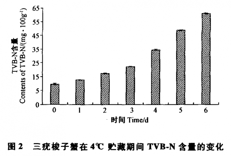 由圖 2可知,TVB-N 含量在貯藏初期變化緩慢,這是由于低溫 (4℃)和真空包裝條 件抑制了蟹肉中微生物的生長和繁殖,導(dǎo)致貯藏前期TVB-N含量增長緩慢 。從貯 藏第 4天開始TVB-N含量顯著上升,含量由34.44mg·100g-1 上升到貯藏第 6 天 的 60.76mg·l00g-1。GB2733—2005 規(guī)定新鮮海蟹的TVB-N含量值應(yīng)低于 25mg·100g-1,貯藏第 3天蟹肉的TVB-N含量為 22.26mg·100g-1,仍屬于新鮮蟹 肉,貯藏第 4天蟹肉的TVB-N含量高于規(guī)定標準,已腐敗變質(zhì),由此表明 TVB-N 可 以反映蟹肉鮮度的變化 。