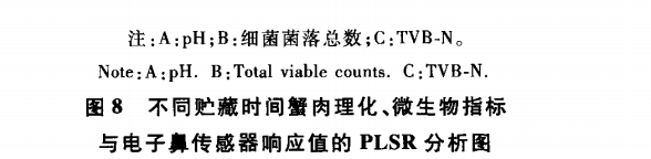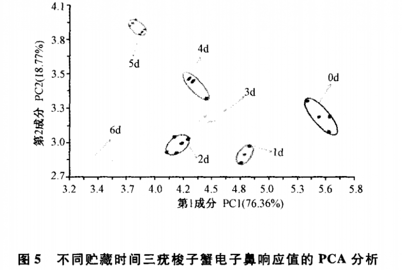 梭子蟹肉的鮮度隨貯藏時間的延長而下降。電子鼻檢測結(jié)果表明,蟹肉在貯藏過程 中主要產(chǎn)生氨、三甲胺、氮氧化合物、硫化氫、二氧化硫等揮發(fā)性物質(zhì),對揮發(fā)性 物質(zhì)采用 PCA 和 LDA分析,均能實現(xiàn)對不同貯藏時間的三疣梭子蟹樣品的有效區(qū)分識別,其中 LDA分析類別內(nèi)部的點更集中,區(qū)分效果更好。此外,電子鼻傳感器信號響應(yīng)值與鮮度指標 pH 值、TVB-N含量、 細菌菌落總數(shù)的相關(guān)性較好,因此,建立的偏最小二乘回歸模型可用于蟹肉 pH 值、TVB-N 含量和細菌菌落總數(shù)的預(yù)測分析。本研究為進一步研究電子鼻在蟹及其他水產(chǎn)品鮮度定量評價方面奠定基礎(chǔ) 。
