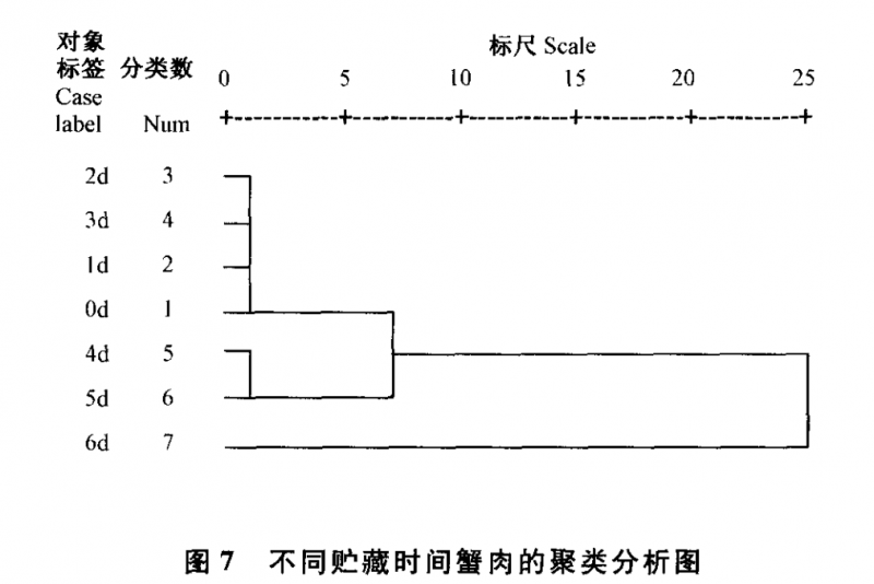 表 1顯示了各樣品氣味的差異程度,歐基里德距離越大說明差異越顯著。聚類分析的樹狀圖可以更直觀地反映不同樣品差異顯著程度。由圖 7可知,貯藏第 1、第 2、第 3天的蟹肉與新鮮蟹肉的歐基里德距離較小,貯藏第 4天與第 5天蟹肉之間的歐基里德距離較大,貯藏第 6天的蟹肉明顯與其它樣品的歐基里德距離相差較大,說明隨貯藏時間的延長樣品氣味的差異性越來越大,貯藏第 6天的蟹肉氣味與其它 樣品差異性極顯著 (P<0.01),該結(jié)果與 PCA、LDA 的結(jié)果相一致。