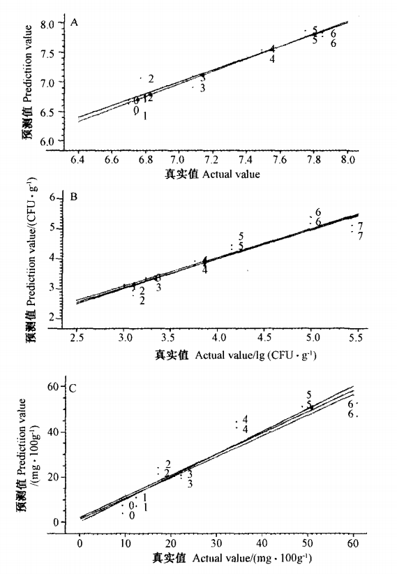 pH值、TVB-N 含量、細菌菌落總數(shù)建立預(yù)測模型的主因子數(shù)分別是 5、4、2。由圖 8可知,3個預(yù)測模型的校正決定系數(shù) R 均大于 0.900,預(yù)測決定系數(shù) R 均大于 0.870,表明電子鼻傳感器響應(yīng)值與 pH值、TVB-N含量、細菌菌落總數(shù)的相關(guān)性較好。經(jīng)統(tǒng)計學(xué)分析可知,pH 值的 RPD 值是 2.73,TVB-N 含量的RPD值是 2.50,細菌菌落總數(shù)的 RPD值是 3.06,說明該預(yù)測模型對于細菌菌落總數(shù)的預(yù)測精度高,穩(wěn)定性好;pH值和 TVB-N的 RPD值在 2.5~3之間,說明該預(yù)測模型是可行的,但預(yù)測精度需進一步提高。