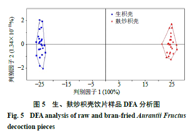 2.6.3 判別因子分析(discriminant factor analysis,DFA) DFA是在主成分分析的基礎(chǔ)上,根據(jù)某些準(zhǔn)則建立判別函數(shù),將不同組別樣本的差異擴大,使同類樣本間差異縮小的一種具有判別分類功能的數(shù)據(jù)模型,可以用來識別和分類未知樣本[11,17]。對生、麩炒枳殼樣品的超快速氣相電子鼻數(shù)據(jù)進行判別因子分析,結(jié)果如圖5所示,橫、縱坐標(biāo)分別表示DFA轉(zhuǎn)換得到的第1區(qū)分指數(shù)(DF1)和第2區(qū)分指數(shù)(DF2)。圖中DF1的區(qū)分指數(shù)為100%,說明DFA分析法能夠更好地從氣味角度區(qū)分生、麩炒枳殼樣品,且二者距離較遠,氣味明顯改變,差異較大,這也符合實際感官描述。表明氣相電子鼻可以快速鑒別生、麩炒枳殼飲片,進一步驗證了PCA的分析結(jié)果。
