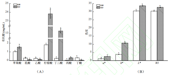 圖2 百香果果汁及果酒中的有機酸含量(A)和色澤變化(B)