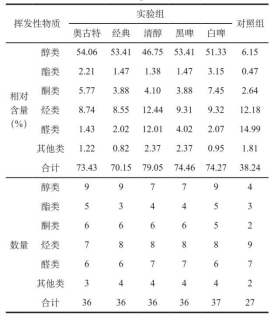 通過GC-MS測定不同種類啤酒制作啤酒鴨樣品的風味物質及其相對含量。各樣品鑒得醇類、酯類、醛類、酮類、烴類以及其他類(醚類、含氮類及呋喃等)揮發性化合物,其中來源于啤酒的醇類物質占據實驗組最重要位置。由表3可知,實驗組所檢測的揮發性化合物,各樣品風味物質含量皆不同,但醇類和烴類都為其主要化合物,種類及含量皆高于對照組。