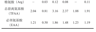 由表4可知,啤酒鴨中共檢測到16種游離氨基酸,其7種人體必需氨基酸中苯丙氨酸、蘇氨酸、異亮氨酸、亮氨酸、纈氨酸在所有啤酒鴨中均有檢出。清醇組及清水對照組中各氨基酸均能檢出(16種),白啤組氨基酸種類次之(15種),種類最少為奧古特組(11種)。
