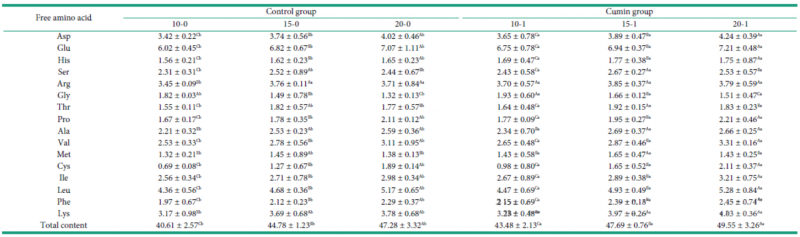 表1 孜然對烤羊肉餅游離氨基酸含量的影響