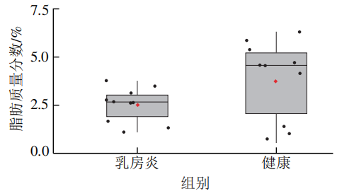 如表1和圖1所示,脂肪質(zhì)量分數(shù)、密度、蛋白質(zhì)量分數(shù)、冰點4 個指標P值均小于0.05,具有顯著差異,與健康組相比,乳房炎組牛乳脂肪質(zhì)量分數(shù)顯著降低(P<0.05)。脂肪在體細胞數(shù)量較多的牛乳中顯著下降,可能是由于乳房發(fā)炎期間乳腺細胞合成和分泌能力下降。乳房炎牛乳中蛋白質(zhì)含量增加,可能是由于奶牛患乳房炎后會增加乳房毛細血管的通透性,從而使蛋白含量增加。其余指標在兩種牛乳間差異不顯著(P>0.05)。