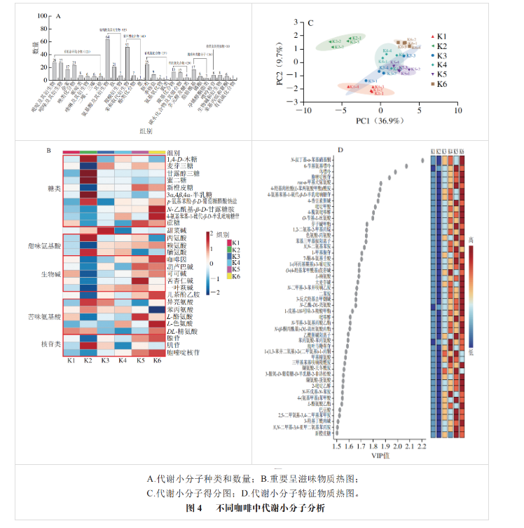 通過PLS-DA對不同咖啡代謝小分子的關系進行綜合分析。由圖4C可知,K1、K2是淺度烘焙咖啡,在PC1的負半軸,中度、中深度烘焙咖啡在PC1的正半軸、原點附近,可以明顯區分。由圖4D可知,L-酪氨酸乙酯、色氨酸-丙氨酸、纈氨酸-天冬酰胺等12種氨基酸及肽類似物,巴豆酸、戟葉馬鞭草苷等5種脂類,鳥嘌呤、1-甲基腺苷等48 個化合物是引起各樣品差異的主要差異代謝物(變量投影重要性(VIP)>1.5)。區分6 種不同咖啡的烘焙度及產地,可直接選用部分呈滋味化合物,如胞嘧啶核苷、賴氨酸、新橙皮糖等,但更多的是與咖啡的非呈滋味代謝物有關。有研究通過超高效液相色譜串聯質譜進行代謝組學分析得到36 種云南小粒咖啡與埃塞俄比亞咖啡的潛在標志物,包括多酚16 種、脂質類8 種、糖類6 種以及少量生物堿類、有機酸類、萜類。