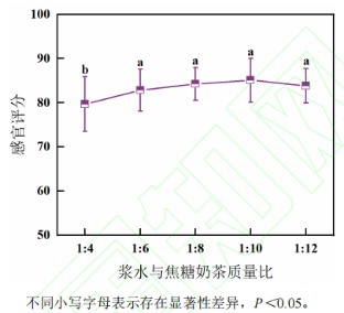 漿水和焦糖奶茶質量比對感官評分的影響如圖3所示。由圖3可知,漿水中所含有的乳酸屬于酸性物質,pH值較低,當漿水比例較高時,會導致焦糖奶茶中蛋白質遇酸變性析出,形成不溶性固體,嚴重影響視覺感受。