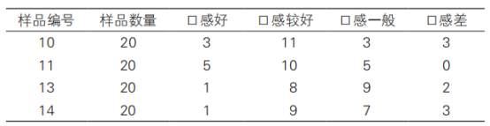 選擇 20 名感官評價員(10 名男性和 10 名女性,年齡24 ~ 40 歲),進行感官評估。評價員對口感進行評分,分為好(9 ~ 10 分)、較 好(7.5 ~ 8.9 分)、一般(6 ~ 7.4 分)、差(6 分以下)四個等級。