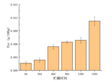 過氧化值是反映油脂氧化的重要指標(biāo),不同貯藏期的POV值如圖1所示。在-18℃條件下,預(yù)制紅燒肉的過氧化值隨貯藏時(shí)間增加而增長,其中只有60d和150d有明顯增加。不同貯藏時(shí)期的TBA反應(yīng)物值如圖2所示,TBA值隨貯藏時(shí)間顯著上升(P<0.05),貯藏0d的MDA含量約為1.07mg/kg,貯藏150d后,MDA含量增加到1.75mg/kg,這是因?yàn)檫^氧化物的不穩(wěn)定性質(zhì)會進(jìn)一步的分解為二次氧化產(chǎn)物如丙二醛。但預(yù)制紅燒肉在-18℃條件凍藏150d的過氧化值和丙二醛含量均低于GB10146—2015的限制量,仍保持在安全的范圍內(nèi)。
