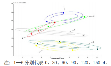 采用主成分PCA分析法,對新鮮紅燒肉至150d凍藏周期的PCA分析結(jié)果見圖4。新鮮紅燒肉至90d凍藏周期均有相交或重疊的部分,而與120d和150d凍藏的沒有相交部分,表明新鮮,30、60、90d凍藏紅燒肉的氣味不能顯著地區(qū)分開,而120d和150d凍藏的與前面的香氣組分能顯著區(qū)分,有所衰減。說明了紅燒肉氣味隨凍藏時(shí)間的延長,前期變化小,而120d后風(fēng)味有所衰減,但衰減程度不大。