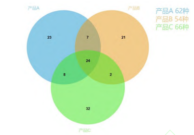 表2展示了不同市售霉莧菜梗中檢測出揮發(fā)性成分種類、數(shù)量和含量存在差異,這可能和霉莧菜梗的發(fā)酵原料、微生物以及發(fā)酵過程有關(guān)。采用NIST11標(biāo)準(zhǔn)譜庫檢索進(jìn)行對比定性分析,保留相似度大于80%的化合物,共檢測出揮發(fā)性風(fēng)味成分117種,其中醛類15種、醇類32種、酯類20種、酮類11種、酸類5種、酚類6種烷類10種、烯烴類12種、醚類2種和其他類5種(表2)。不同市售霉莧菜梗鑒定出的揮發(fā)性成分?jǐn)?shù)量不同,產(chǎn)品A、B、C分別鑒定出62、54、66種揮發(fā)性風(fēng)味成分,3種霉莧菜梗共有揮發(fā)性風(fēng)味成分有24種(圖3)。