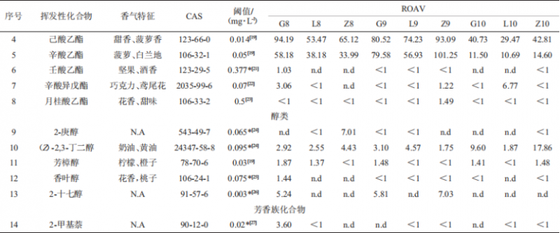 不同產(chǎn)地同一采收時(shí)間火龍果的發(fā)酵酒樣品中的揮發(fā)性風(fēng)味成分種類(lèi)數(shù)多少排序?yàn)闃悠稧8(54)>L8(49)>Z8(40),樣品G9(53)>Z9(49)>L9(48),樣品L10(44)>Z10(40)>G10(39)。