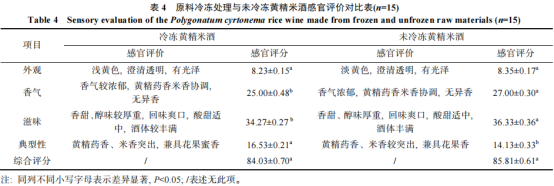 從表中可以看出,冷凍黃酒米酒與未冷凍黃精米酒在外觀及總體感官評分方面無顯著差異,但在香氣、滋味、典型性方面存在顯著差異(P<0.05)。具體表現在冷凍黃精酒有更強的典型性,有草藥香兼具蜜香;而未冷凍黃精酒在香氣和滋味方面均優于冷凍黃精酒,呈現甜果香兼具蔬菜香。