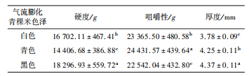 由表3可知:3種氣流膨化青稞米的硬度、咀嚼性、厚度均存在顯著差異。其中,硬度和厚度最大的是膨化黑色青稞米,但其咀嚼性不是三者中最佳的,而硬度最小的膨化青色青稞米的咀嚼性卻是最好的,可能是青稞米硬度和厚度過大會影響咀嚼性。