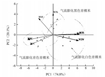 由圖2可知:3種氣流膨化青稞米電子鼻傳感器的響應值排序為W5S(對烯烴敏感)>W2W(對有機硫化物敏感)>W1W(對硫化物、吡嗪敏感)>W1S(對甲基敏感)>W2S(對醇、醛、酮敏感)>W6S(對氫化物有選擇性)>W3S(對烷烴敏感)>W5C(對短鏈烷烴芳香成分敏感)>W1C(對芳香成分敏感)>W3C(對氨水、芳香成分敏感)。其中W1W傳感器差異最大,W1S感器差異最小。總體來看,W5S、W2W、W1W、W1S、W2S5個傳感器均存在顯著差異,其中氣流膨化白色青稞米的響應值都最高,氣流膨化黑色青稞米的響應值都次之,氣流膨化青色青稞米的響應值都最低,可見氣流膨化白色青稞米的風味濃度相對較高,氣流膨化黑色青稞米次之,氣流膨化青色青稞米相對較低。