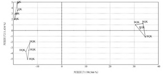 由圖3可知:PC1和PC2對總方差的貢獻率分別為99.925%和0.07441%,總和接近100%,說明電子舌能夠區分三種氣流膨化青稞米的滋味變化信息,且3者之間的滋味存在差異。由圖4可知:第1區分指數為98.566%,第2區分指數為1.434%,二者合計為100%,可見判別因子分析3種色澤氣流膨化青稞米滋味差異的效果更好,膨化白色青稞米與膨化青色青稞米、膨化黑色青稞米滋味存在較大差異,膨化青色青稞米與膨化黑色青稞米滋味存在較小差異。