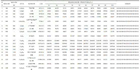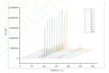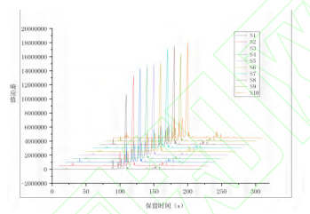 利用電子鼻對10種不同產地草果樣品進行的檢測分析及后續數據處理,獲得了在MXT-5色譜柱和MXT-1701色譜柱上的氣味指紋圖譜,結果如圖2、圖3所示,觀察到不同產地草果的氣味成分色譜峰在出峰時間和峰面積上均呈現出明顯差異。若通過比對放大色譜圖來尋找樣品組間的差異,此過程較為繁瑣與復雜。為了提高分析效率,故采用先統計后化學分析的方法,首先,通過PCA法對不同產地草果樣品的氣味進行統計分析,識別氣味上的差異。在PCA分析的基礎上,進一步確定差異色譜峰。隨后,利用AroChembase數據庫對這些差異色譜峰進行定性分析。