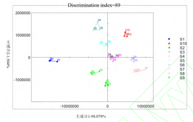 主成分分析(Principal Component Analysis,PCA)是一種常用統計分析方法,它可以將多個變量轉換為少數幾個主成分,從而簡化數據分析。本研究使用PCA算法對電子鼻采集的原始數據進行分析,通過計算主成分識別指數(Discrimination Index,DI)和貢獻率來識別變量。通過PCA分析,可以有效地揭示不同產地草果樣品氣味特征的差異。第一主成分(PC1)與第二主成分(PC2)的區分貢獻率之和為99.58%(圖4),表明這兩個主成分足以解釋10種不同產地草果樣品間的絕大部分的氣味差異,驗證了PCA模型能夠非常好地反映不同產地草果樣品間的氣味差異。識別指數(DI)是一種量化指標,用于衡量數據集或實驗結果中不同樣品或樣本之間的區分度。DI的數值大小直接關聯于數據集中樣本間的差異性。DI值越大,表示數據集中不同樣品或樣本之間的區分度越高,即模型或實驗方法的區分效果越好。草果樣品在主成分分析圖上的DI值達到89,進一步表明基于氣味特征的差異可以有效地區分10種不同產地的草果樣品。