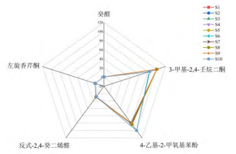 圖5展示了10種不同產地草果在PCA分析中兩兩樣品間距離柱狀圖,距離的遠近直觀反映了兩兩樣品間氣味差異的大小。距離越近則代表樣品間氣味差異性越小,距離越遠代表樣品間氣味差異性越大。圖中S3與S4草果樣品的距離最近,表明兩者之間氣味差異性最小;而草果樣品S1與S7距離最遠,意味著S1與S7樣品間氣味差異性最大。