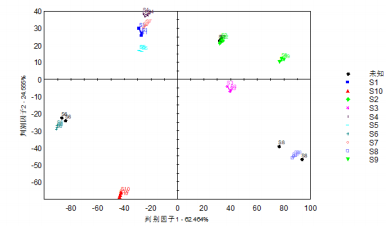 在主成分分析基礎上,對10種不同產地草果樣品進行判別因子分析,分析結果如圖8顯示,判別因子1判別指數為62.46%,判別因子2判別指數為24.56%,不同產地草果樣品組內分布集中且離散程度小,組間分布離散程度大,表明該分析方法能夠有效地區分不同產地的草果樣品。進一步地,將3種不同產地的草果未知樣本的圖譜信息投射到已建立的DFA模型中,每種未知樣本均設置了兩組重復。如圖8所示,通過模型判定,3種未知樣本分別被準確歸類到S2、S6和S8三個不同的產地。具體到每個未知樣本,歸屬于S2產地的樣本識別準確率分別為98.9%和99.2%,歸屬于S6產地的樣本識別準確率分別為95.5%和94.2%,而歸屬于S8產地的樣本識別準確率分別為81.7%和97.2%。這些結果表明,DFA模型對于未知草果樣品的判別具有較高的準確性。因此,基于DFA模型的分析,可以快速而準確地鑒定草果的產地,為草果的產地溯源提供了一種有效的技術手段。