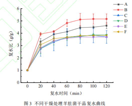 不同干燥方法下的羊肚菌干品復水曲線如圖3所示。各處理組的復水比在80min后復水比趨于平穩,B處理羊肚菌復水比最高,A處理次之,明顯優于其他處理組。